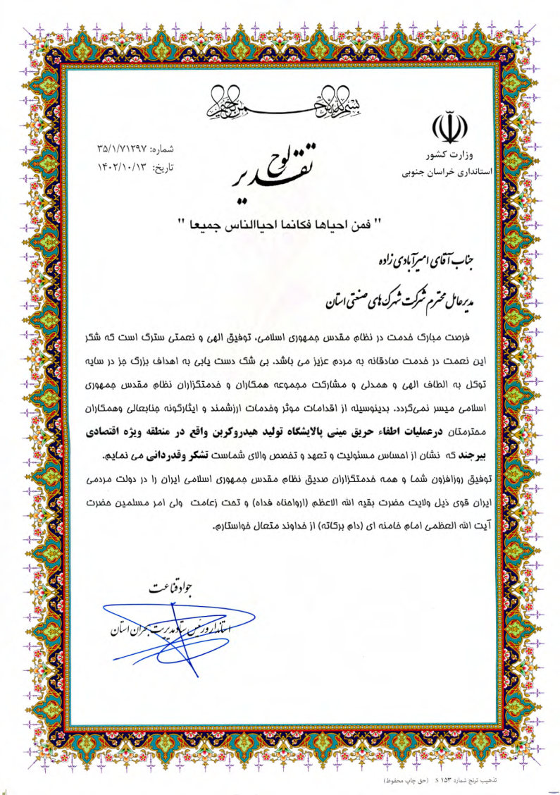 به گزارش روابط عمومی شرکت شهرک های صنعتی خراسان جنوبی، جواد قناعت استاندار محترم خراسان جنوبی از سید علی امیرآبادی زاده رئیس هیئت مدیره و مدیرعامل شرکت شهرک های صنعتی خراسان جنوبی و همکاران آتش نشانی بیرجند که در عملیات اطفاء حریق در منطقه ویژه اقتصادی بیرجند کمک کردند طی لوح تقدیر کرد. متن آن به شرح ذیل است: