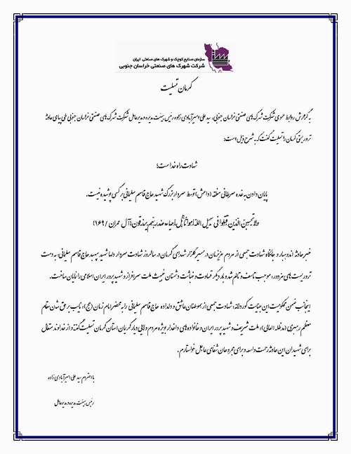 پیام تسلیت مدیرعامل و پرسنل شرکت شهرک های صنعتی خراسان جنوبی درخصوص حادثه تروریستی کرمان
